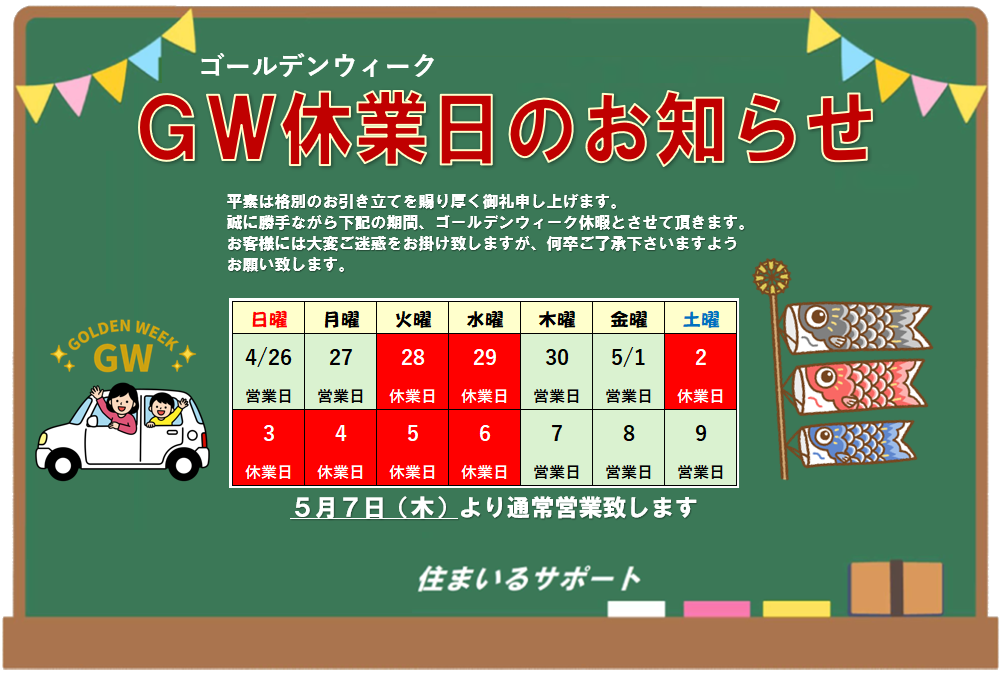 ゴールデンウィーク休業日のお知らせ|住まいるサポート|弥富市含む海部・名古屋市・三重北部各エリア 売買仲介 相続相談 空き地・空き家管理